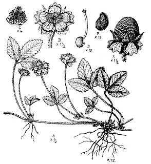 Duchesnea indica A: planta, B: flor, C: gineceo, D: carpelo, E: fruto, F: aquenio (de A.L. Cabrera 1967, Fl. Bs. As., INTA)